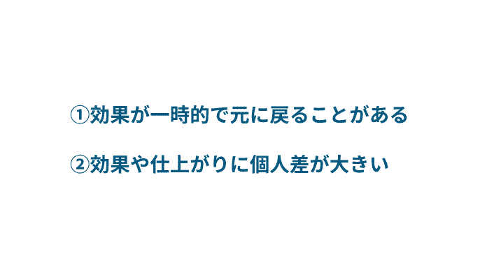 | 効果の持続性 | 体質や生活習慣によって、長さが戻るケース・希望した効果を実感できないことがある。 |