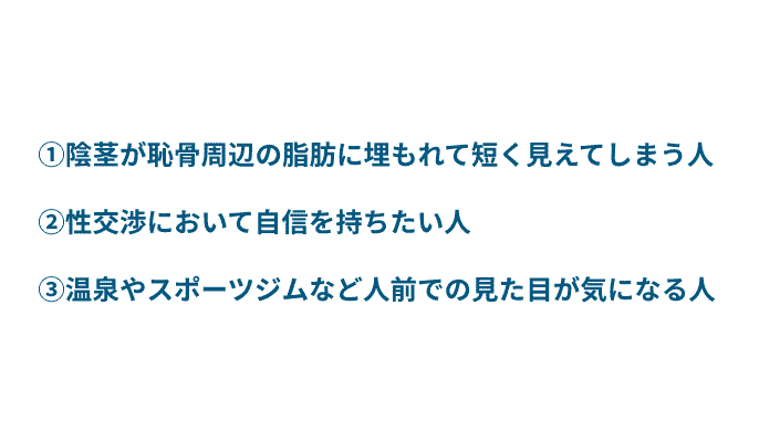 恥骨周辺の脂肪が多く、陰茎が埋もれて短く見えてしまう方には、長茎術がおすすめです。