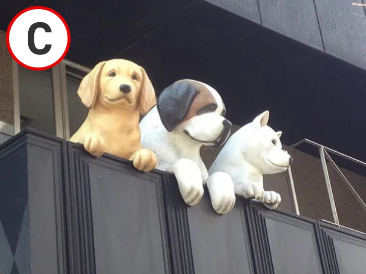 Bを過ぎ、少し歩くと右手に3匹の犬のオブジェが見えます。その先の交差点を右折してください。 -