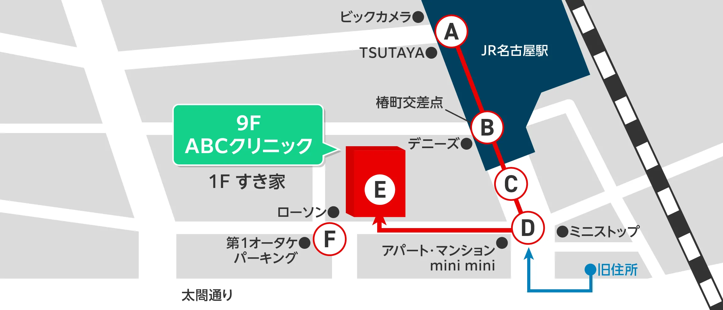 JR名古屋駅 太閤通口 徒歩4分 またはE11西出口徒歩2分。1階がすき家のビルです。