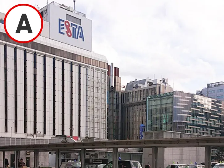 南口を出ると、左側に旧ESTA(エスタ)ビルが見えますので、そちらの方まで歩きます。 -