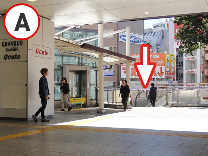 • 立川駅南口へ。透明なエレベーターの横の降りて歩道をへ進みます。