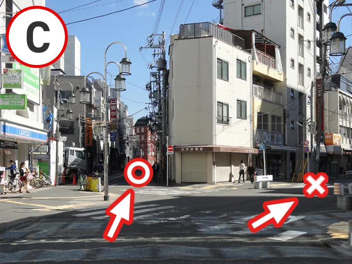 • しばらく進むと左手にローソン付近で二又に分かれます。そのまま左側(線路沿い)を直進します。