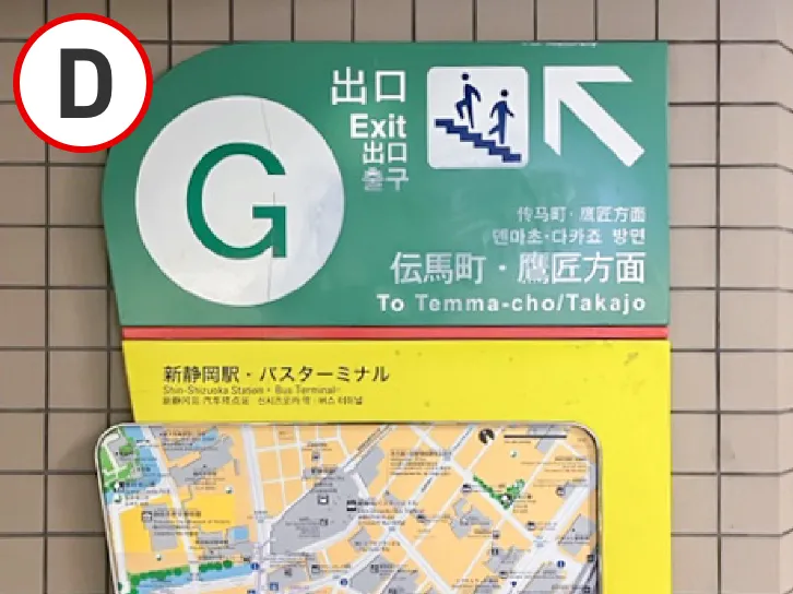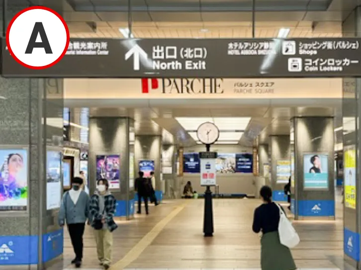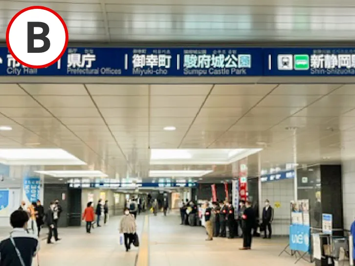• 改札を出て北口へ向かいます。静岡県庁・市役所方面へ続く地下道を進みます。
