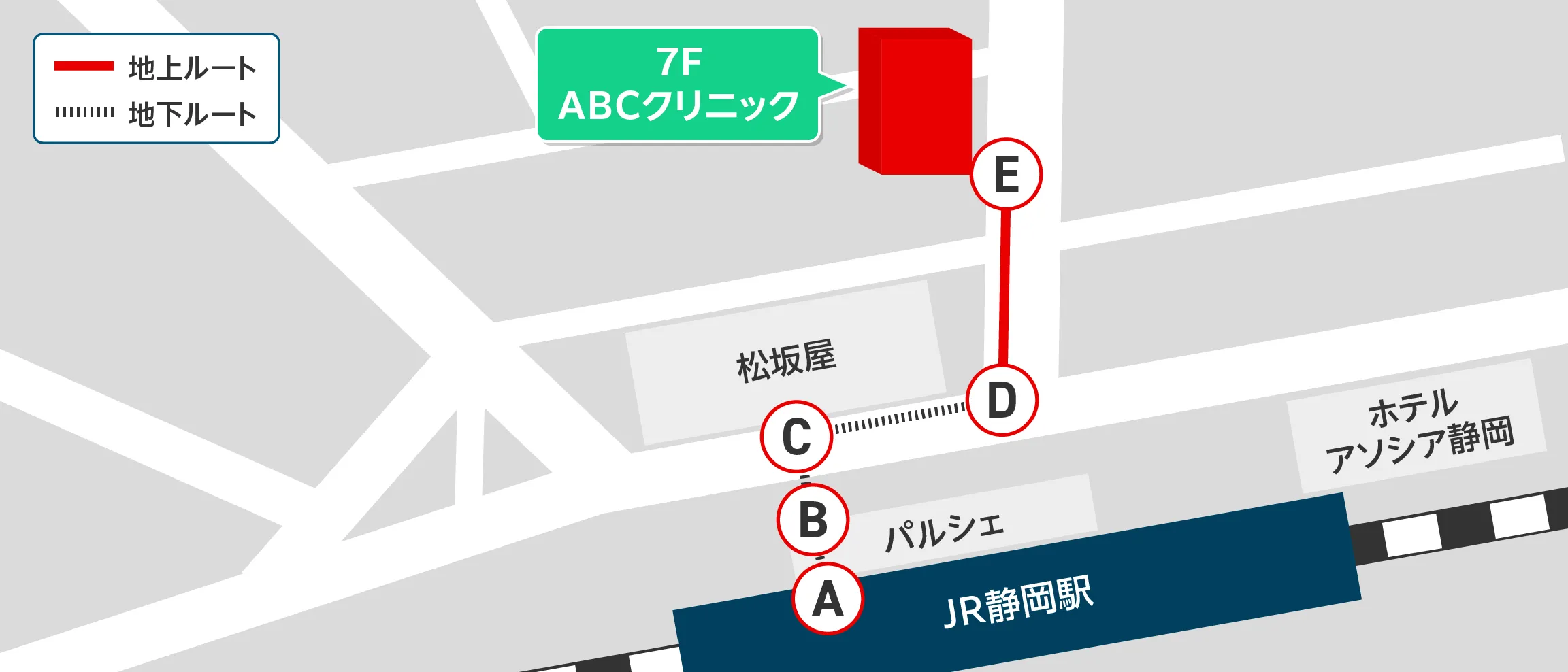 JR静岡駅 徒歩7分 北口地下道のGまたはF出口から地上に出て、駅を背に直進。(松坂屋静岡店沿い)2、3分進むと右手に見える、床から柱看板が2本立っているビルの7Fです。