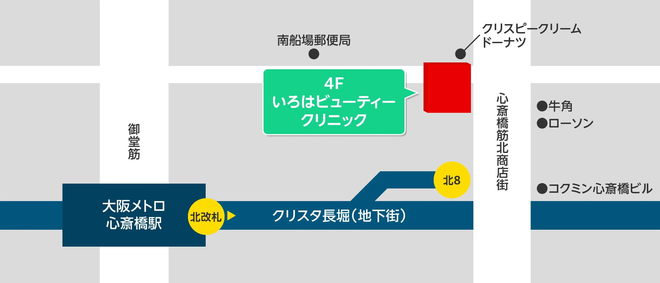 大阪メトロ 心斎橋駅 徒歩1分 北改札から出て、クリスタ長堀の北8出口をご利用ください。牛角の向かいのビル入り口から入って、4Fまでお越しください。