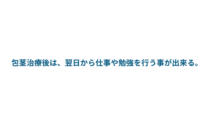 包茎治療後は、仕事や勉強などは翌日から再開できます。ただし、激しい運動は2週間ほど控え、性交渉は術後4週間は避けてください。