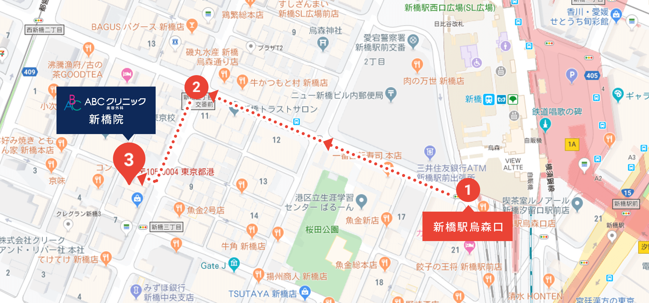 新橋駅の烏森口から歩いて5分程でご来院が非常に便利な立地です。