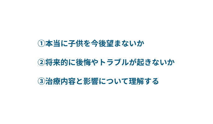 治療を検討する際は、子どもを今後望まないかどうか、将来的な後悔の可能性、治療内容の理解など重要ポイントを十分に話し合うことが大切です。